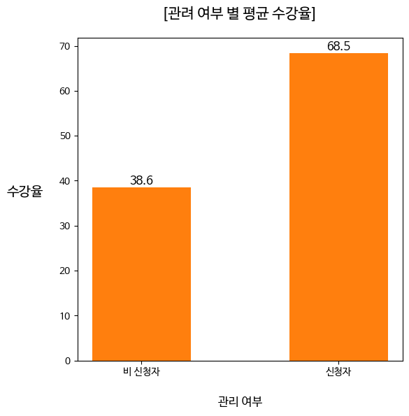 plt.title('[관려 여부 별 평균 수강율]',fontsize=15,pad=20)