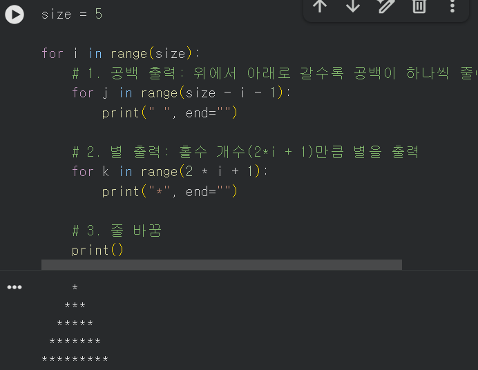 그리고 나서, 강의 내용에는 없었지만 정삼각형을 한번 만들어보기로 했는데. 아래로 갈수록 공백이 하나씩 줄어드는 규칙성과 1개부터 시작해서 홀수 개의 별이 나오는것에 착안하여 코드를 작성했다.