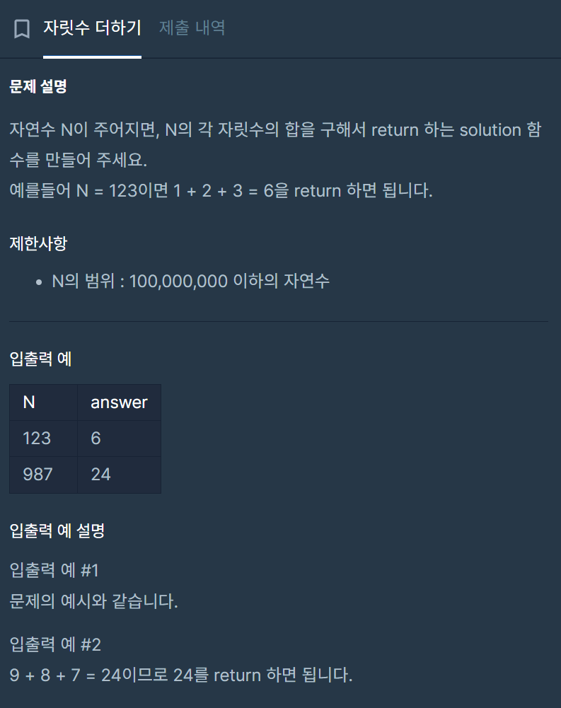 2> 튜터님께서 세션을 진행하시고, 마지막에 프로그래머스 자릿수 더하기 과제를 한번 풀어보라고 하셔서 풀이법을 생각해보고 그에 맞게 코드를 작성해보았다.