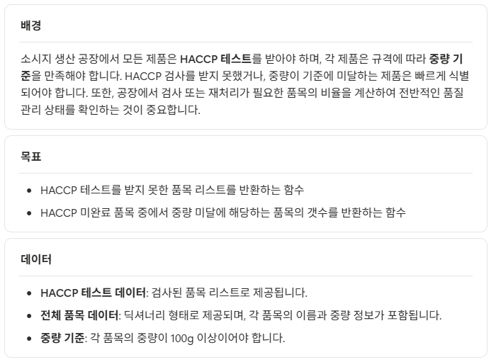 1. factory_products는 딕셔너리고 미검사 품목 리스트는 리스트였다. 따라서 factory_products의 key값만 뽑아내서 리스트로 만든다.