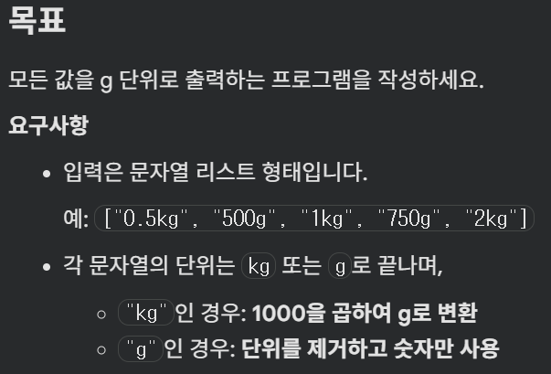 new_list.append(int(float(w[:-2])*1000)) #0.5kg가 정수가 아니므로 float으로 변환해서 곱해주고 int로 다시 변환