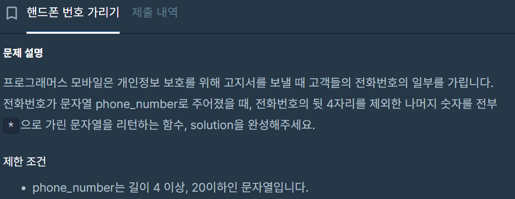 1. 입력받은 phone_number 길이 - 4의 값에 *를 곱해준다