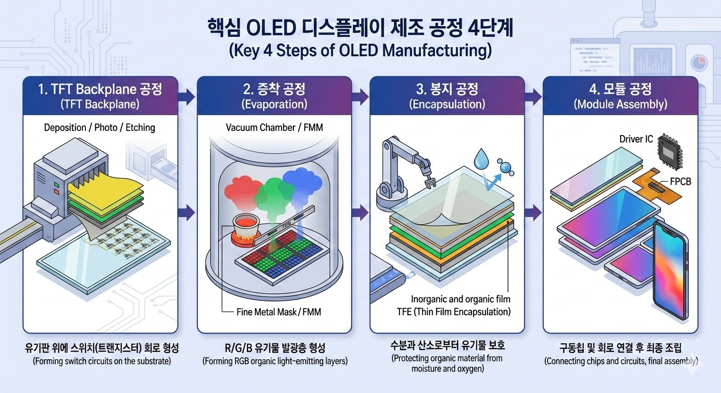 | 3.봉지(Encapsulation) | 유기물이 수분과 산소에 닿지 않도록 TFE(Thin Film Encapsulation)라는 얇은 보호막을 층층이 쌓아 밀봉합니다. | |||
